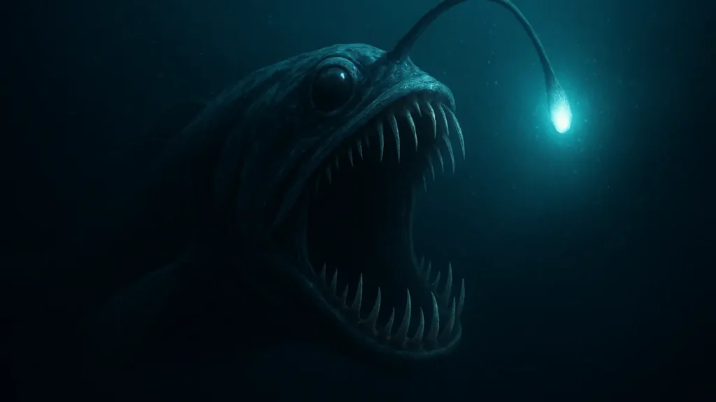 - Peixe-pescador (anglerfish): a fêmea usa um apêndice luminoso para atrair presas no escuro. A boca grande e dentes pontiagudos criam uma aparência de pesadelo. Nas cenas, procure o brilho oscilante como um isqueiro afundado.
